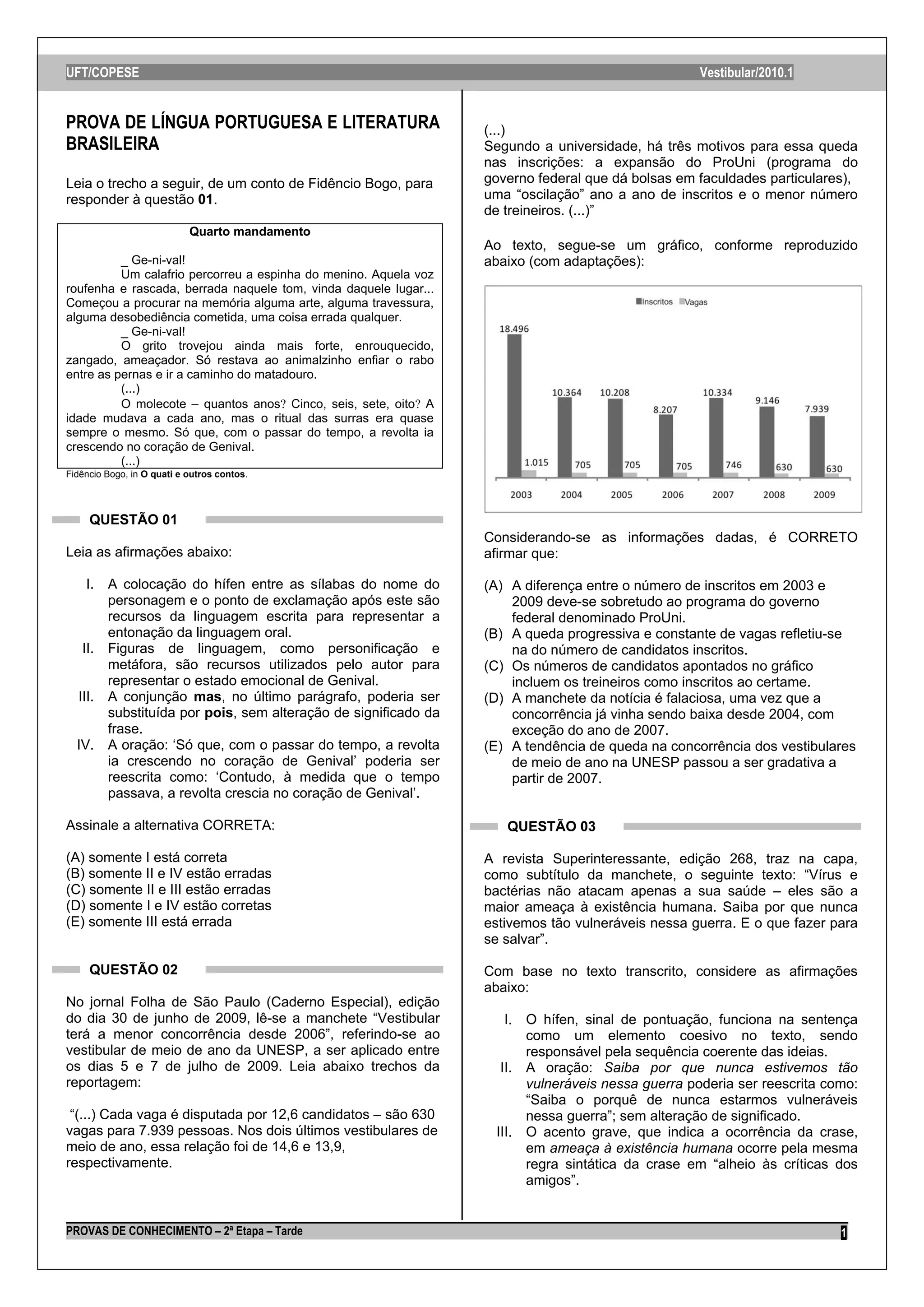 O documento apresenta trechos de uma prova de língua portuguesa e literatura brasileira contendo questões sobre um conto de Fidêncio Bogo e poemas de Manoel de Barros. O sumário é: