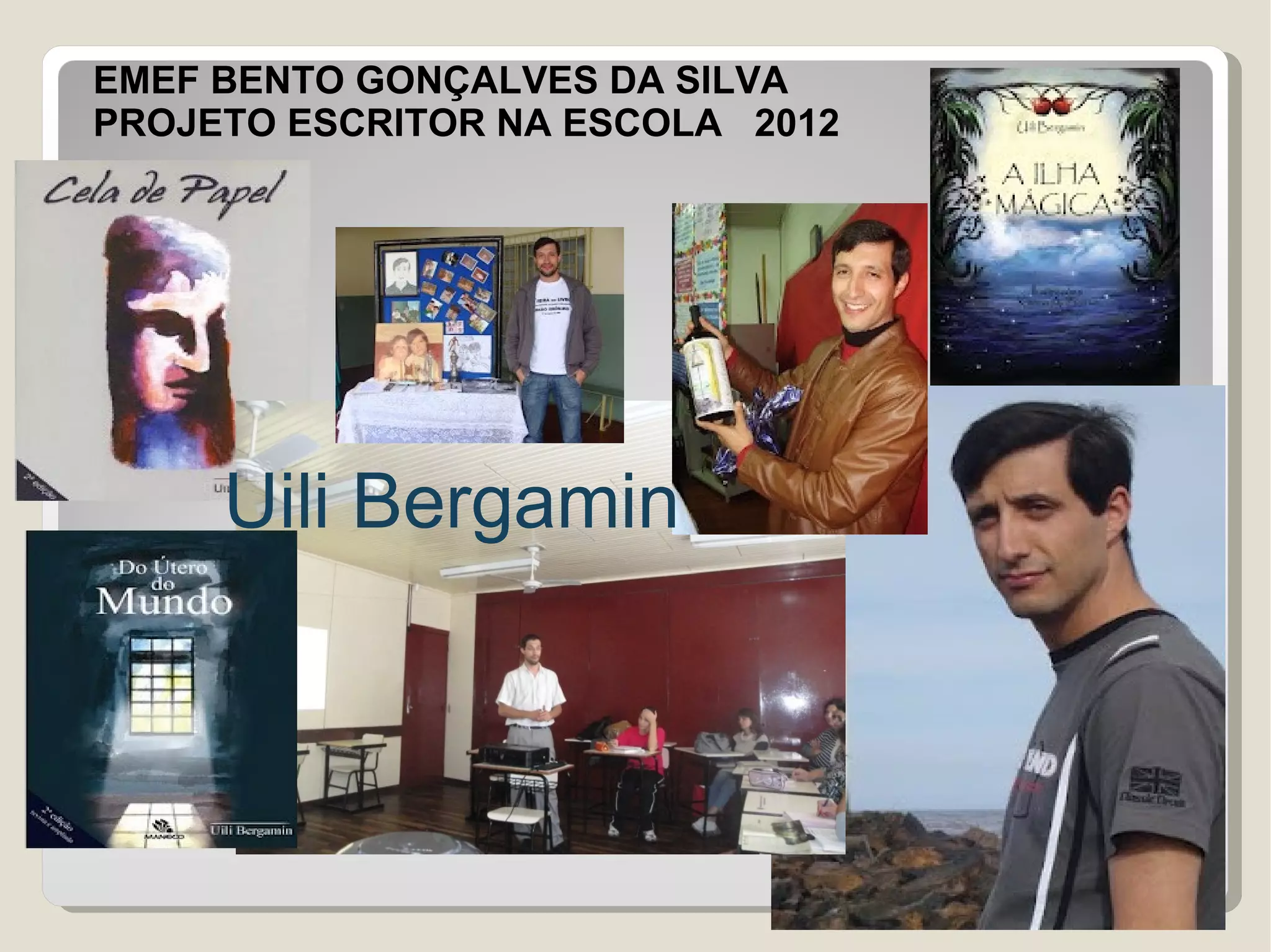 O documento descreve o escritor Uili Bergamin e seu trabalho literário, incluindo seus livros publicados e prêmios recebidos. Resume também o projeto "Escritor na Escola 2012" na EMEF Bento Gonçalves da Silva, que apresenta as obras de Uili Bergamin para os alunos.