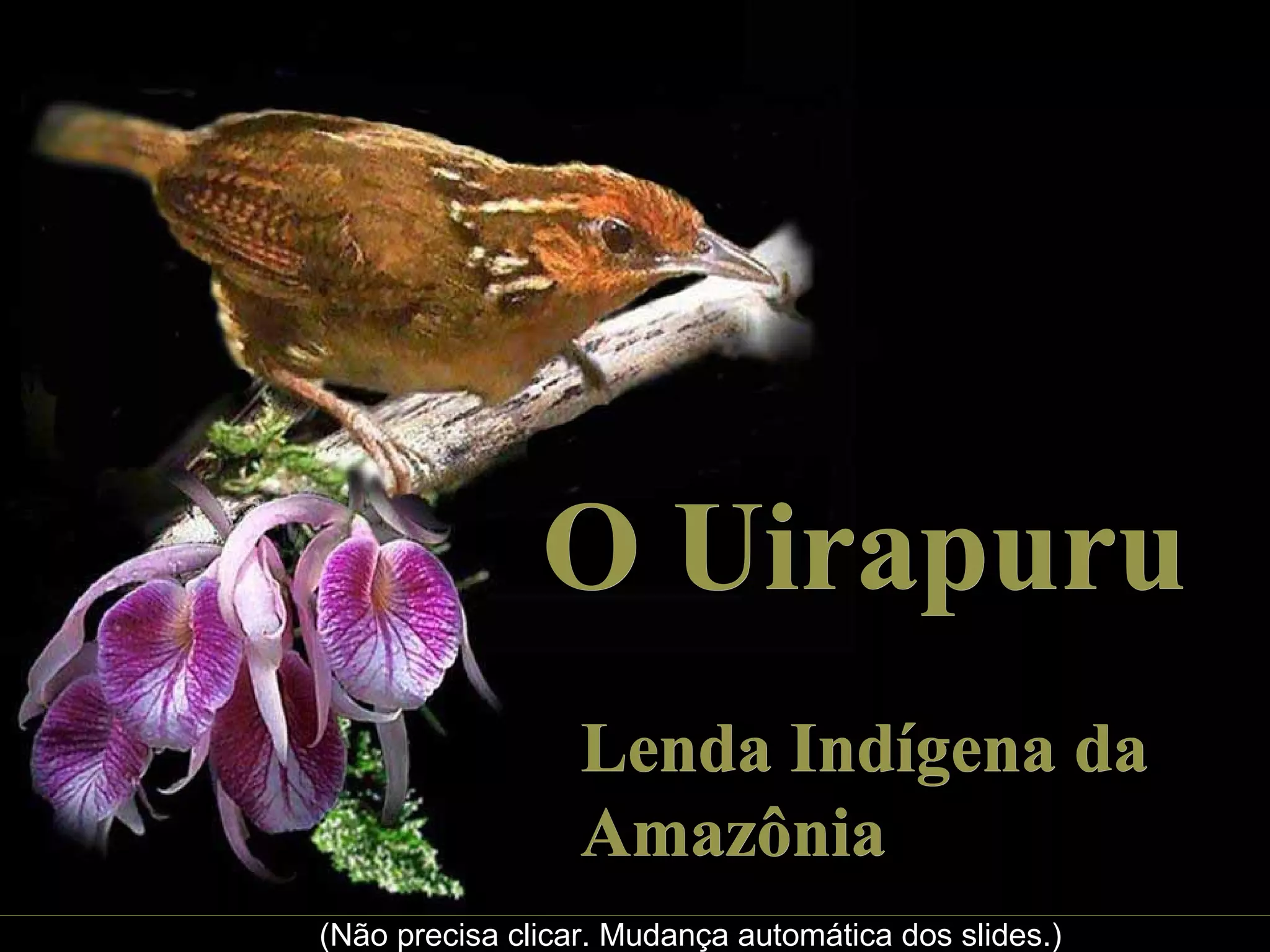 A lenda indígena da Amazônia conta como um belo índio foi transformado em um pássaro invisível chamado Uirapuru após sua morte, cujo canto encanta a floresta mas afasta aqueles que o perseguem, inspirando lendas sobre seus poderes mágicos.