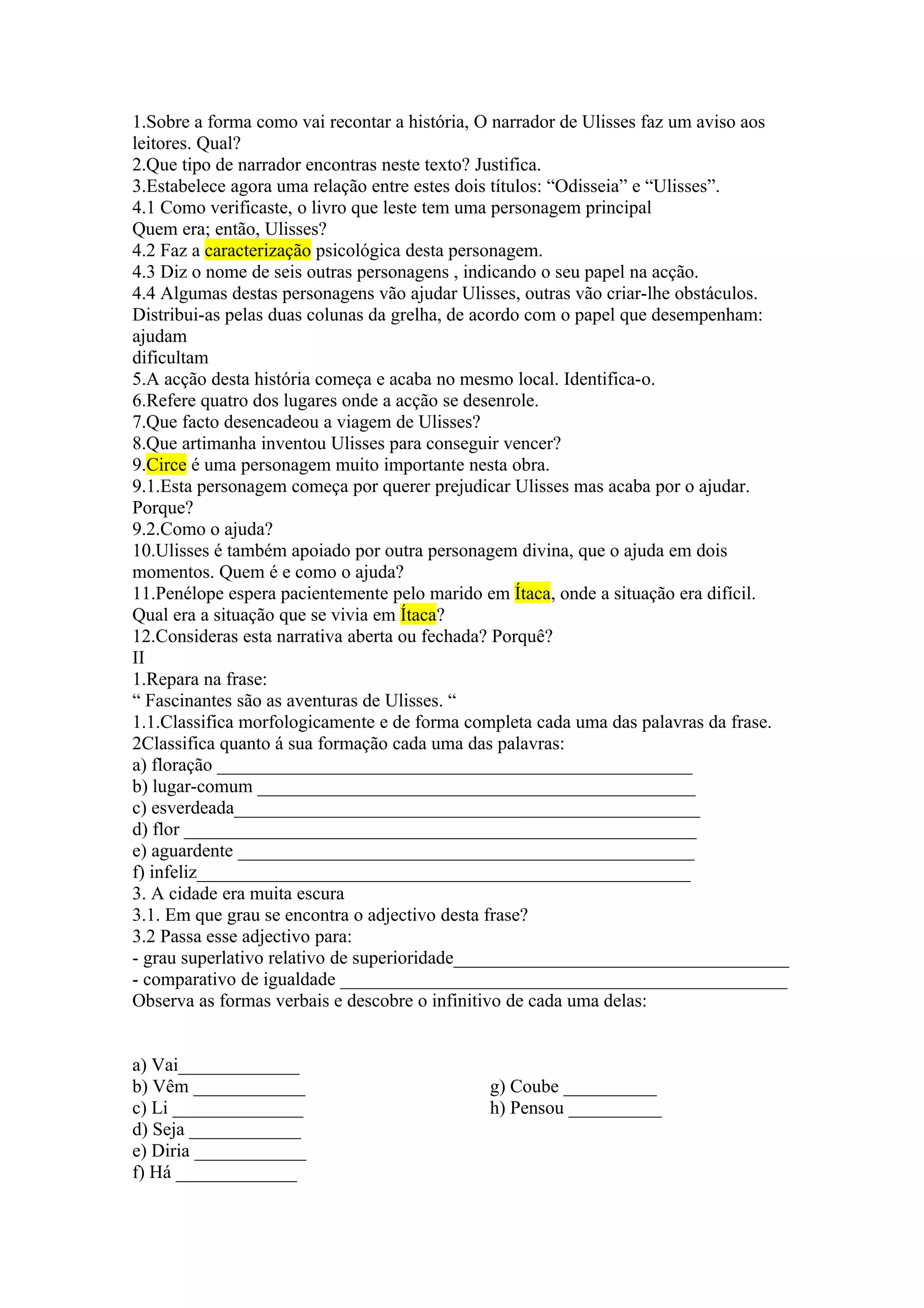 1. O documento discute a obra literária "Ulisses", fornecendo perguntas sobre a narrativa, personagens e eventos da história.