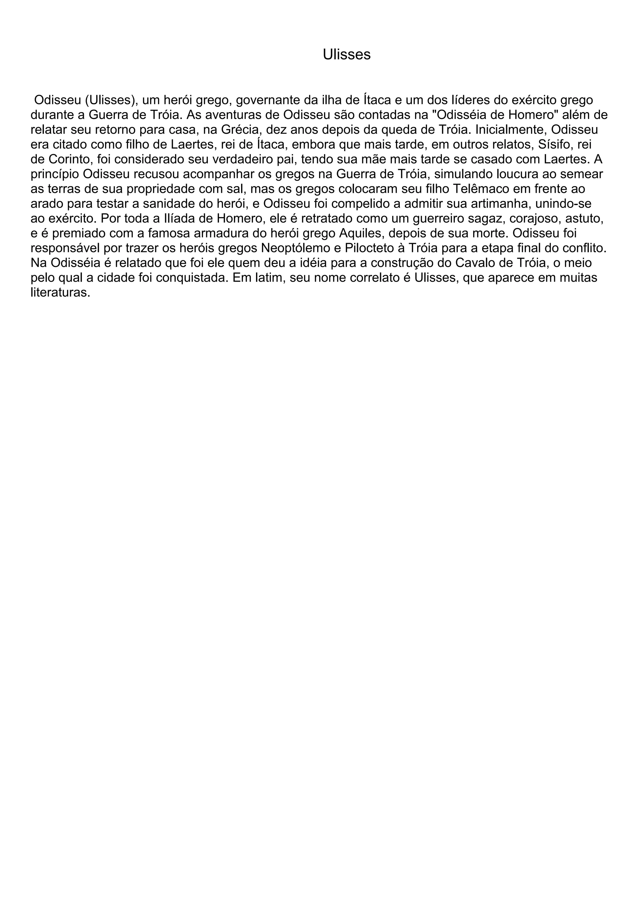 Ulisses (também chamado de Odisseu) era um herói grego que governava a ilha de Ítaca e liderou o exército grego durante a Guerra de Tróia. Após a queda de Tróia, ele enfrentou muitos desafios em uma jornada de dez anos para retornar para casa, como descrito na Odisséia de Homero. Suas aventuras incluíram encontros com o Ciclope e o rei Éolo, que controlava os ventos.