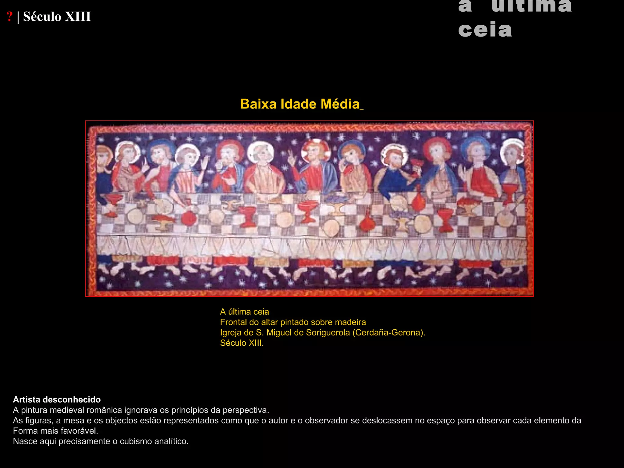 Este documento apresenta várias representações da Última Ceia por diferentes artistas ao longo dos séculos, desde o século XIII até obras contemporâneas. As obras variam em estilo, desde pinturas medievais até trabalhos do Renascimento, Barroco, Maneirismo, Surrealismo e arte contemporânea. Muitos artistas buscaram representar a cena bíblica de forma simbólica ou com soluções pictóricas inovadoras.