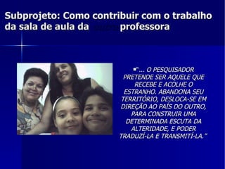 Este documento descreve um projeto de pesquisa que visa contribuir com o trabalho de uma professora em uma sala de aula de 4o ano usando tecnologias interativas e mídias. O objetivo é disponibilizar o uso dessas ferramentas para apoiar a leitura, escrita e aprendizagem dos alunos de forma colaborativa e reflexiva.