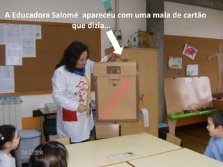 A educadora Salomé trouxe uma mala de histórias para as crianças e contou a história de uma criança que encontrou um animal estranho que parecia um ovo com pés, mãos e rabo. Após descrever suas características, como nariz, bigode e olhos redondos, revelou que era um rato sentado em cima de suas orelhas. No final, um raio atingiu e deixou o rato sem suas orelhas, com medo.