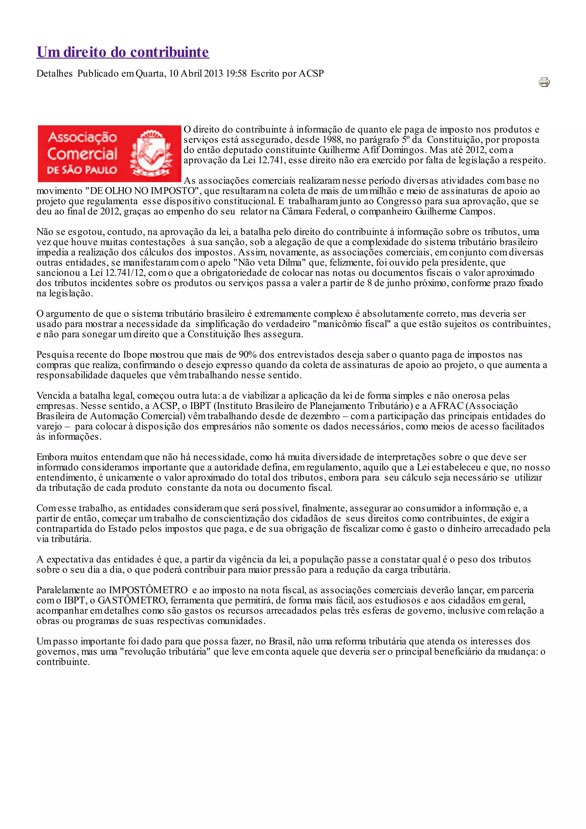 O documento discute o direito do contribuinte saber quanto de imposto paga nos produtos e serviços, consagrado na Constituição em 1988. Uma lei de 2012 regulamentou este direito, mas houve contestações sobre a complexidade do sistema tributário brasileiro. A lei acabou sendo sancionada e entidades vêm trabalhando para viabilizar sua aplicação de forma simples e não onerosa para as empresas.