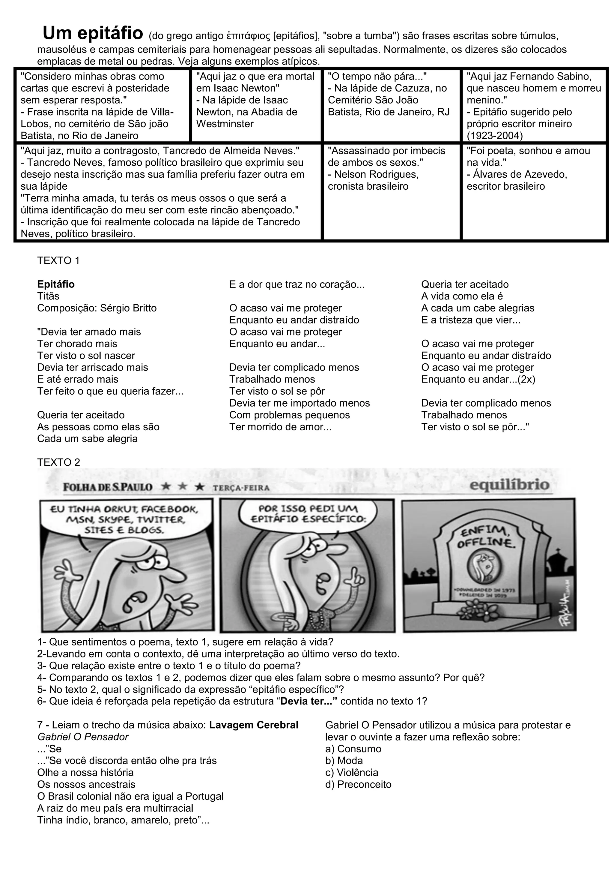 5- No texto 2, qual o significado da expressão “epitáfio específico”?