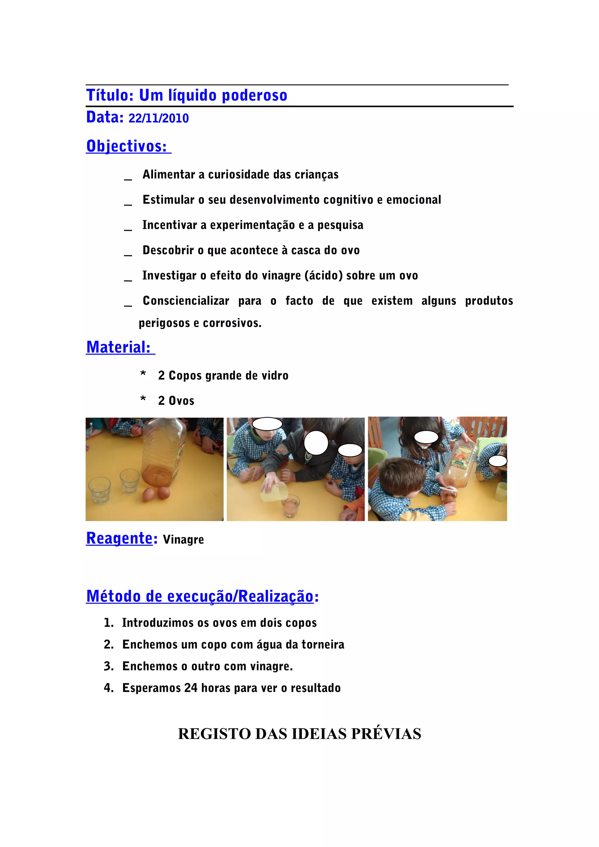 Este documento descreve um experimento científico para crianças que investiga o efeito do vinagre (ácido acético) na casca de um ovo. O objetivo é alimentar a curiosidade das crianças e incentivar a experimentação. O método envolve colocar ovos em copos com água ou vinagre por 24 horas, observando que a casca do ovo no vinagre se dissolve completamente.