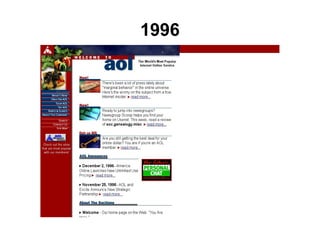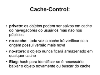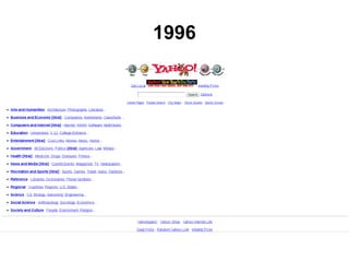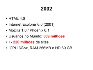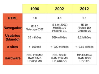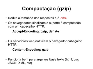 O documento discute a evolução da web entre 1996 e 2015, destacando o crescimento exponencial no número de usuários e sites, além das melhorias tecnológicas como HTML 5 e browsers modernos. Também apresenta métricas de desempenho de sites como UOL e NYTimes ao longo dos anos e estratégias para otimizar o desempenho como CDNs, HTTP/2, cache e compactação gzip.