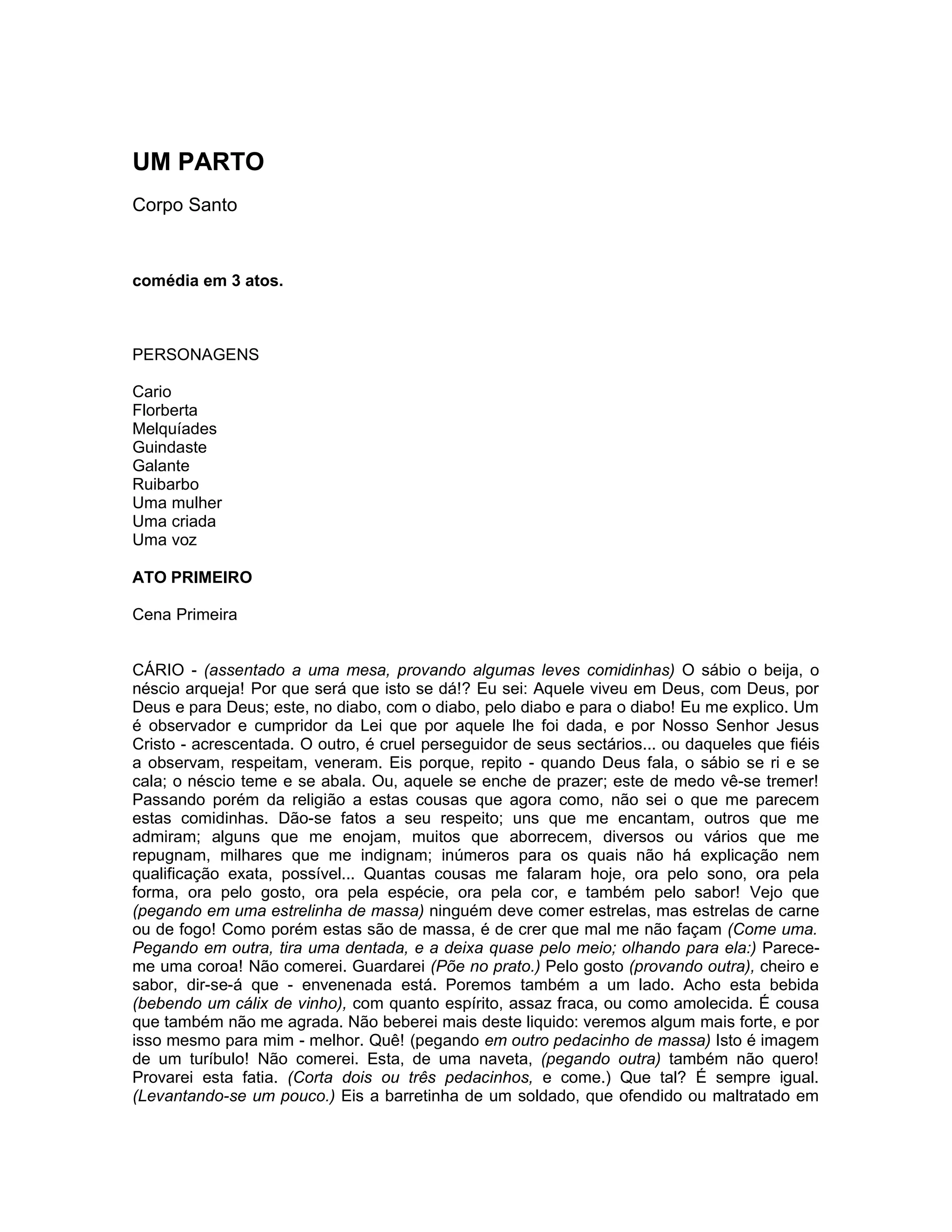 O documento é um resumo de três atos de uma comédia. No primeiro ato, Cário comenta sobre religião e política enquanto come. Florberta canta sobre o destino. No segundo ato, Melquíades reclama das criadas que ainda estão dormindo. Guindaste fala sobre seus problemas de saúde. Galante acha um carrapicho em suas roupas. No terceiro ato, não há detalhes fornecidos.