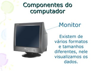 O documento descreve os principais componentes de um computador, incluindo o monitor, CPU, teclado, mouse, estabilizador, modem e meios de comunicação como pen-drive, disquete, CD/DVD e impressora. Ele também lista outros tipos de computadores como e-book, palm, netbook, notebook e Macintosh.