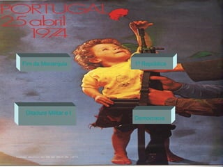 O documento descreve a história política de Portugal do fim da monarquia até a democracia, incluindo a 1a República, a ditadura militar e o Estado Novo, culminando na Revolução dos Cravos de 1974 que estabeleceu a democracia.