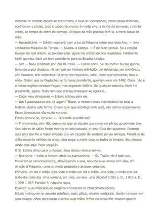 3) Eckels, um dos caçadores, está ansioso para caçar seu alvo, um Tiranossauro Rex, considerado o maior predador de todos os tempos.