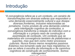 O documento discute a comunicação transmidiática no jornalismo. Apresenta conceitos como convergência, cultura da convergência, cross-media, multimídia e transmídia, e como esses conceitos se aplicam ao jornalismo. Também usa o exemplo do documentário transmídia "Inside Disaster" para ilustrar como a narrativa transmídia pode desconstruir a lógica linear do jornalismo.