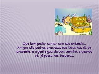 Que bom podercontar com sua amizade... Amigos são pedras preciosas que Deus nos dá de presente, e a gente guarda com carinho, e quando vê, já possui um tesouro...