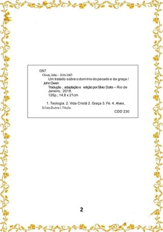 O documento resume um tratado de John Owen sobre o domínio do pecado e da graça. Discutem-se quatro pontos principais: 1) A natureza do domínio do pecado; 2) As evidências deste domínio; 3) Tipos de endurecimento do coração; 4) A razão pela qual o pecado não terá domínio sobre os crentes, que estão sob a graça e não sob a lei.