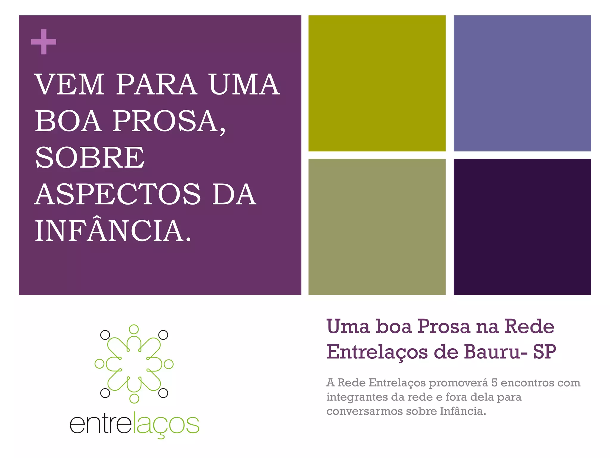 A rede Entrelaços de Bauru-SP realizará cinco encontros mensais de abril a agosto de 2016, promovendo discussões sobre aspectos da infância. Os encontros ocorrerão via Hangouts, com a participação de convidados especializados em temas como brincar, amamentação, alimentação saudável, narração de histórias e convivência intergeracional. A mediadora será Rosana Padial e os eventos visam fortalecer laços e promover cidadania participativa.