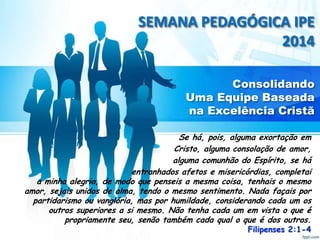 Este documento resume as diretrizes para o desenvolvimento de uma equipe excelente baseada na fé cristã durante a Semana Pedagógica de 2014 no IPE. Apresenta princípios bíblicos como pensar da mesma forma, amor mútuo e humildade. Também discute a importância da comunicação, objetivos comuns e cuidado com os outros membros da equipe.