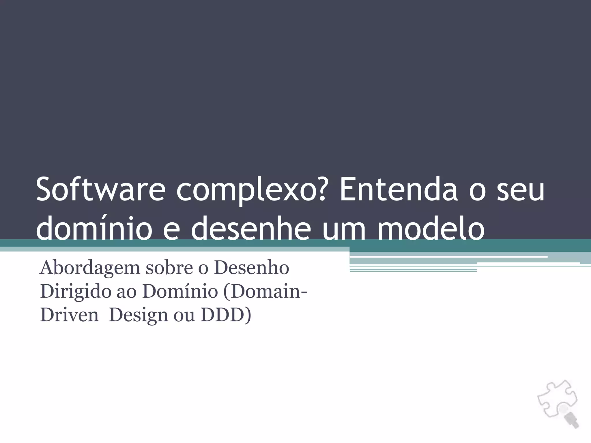 O documento discute os princípios do Domain-Driven Design (DDD), abordando como entender o domínio de um software, desenhar um modelo efetivo e implementar uma arquitetura orientada a domínio. O DDD foca em regras de negócio complexas, baixo acoplamento e independência de tecnologia através de boas práticas como modelagem do domínio, linguagem ubíqua, entidades, objetos de valor, agregados, serviços, repositórios e fábricas.