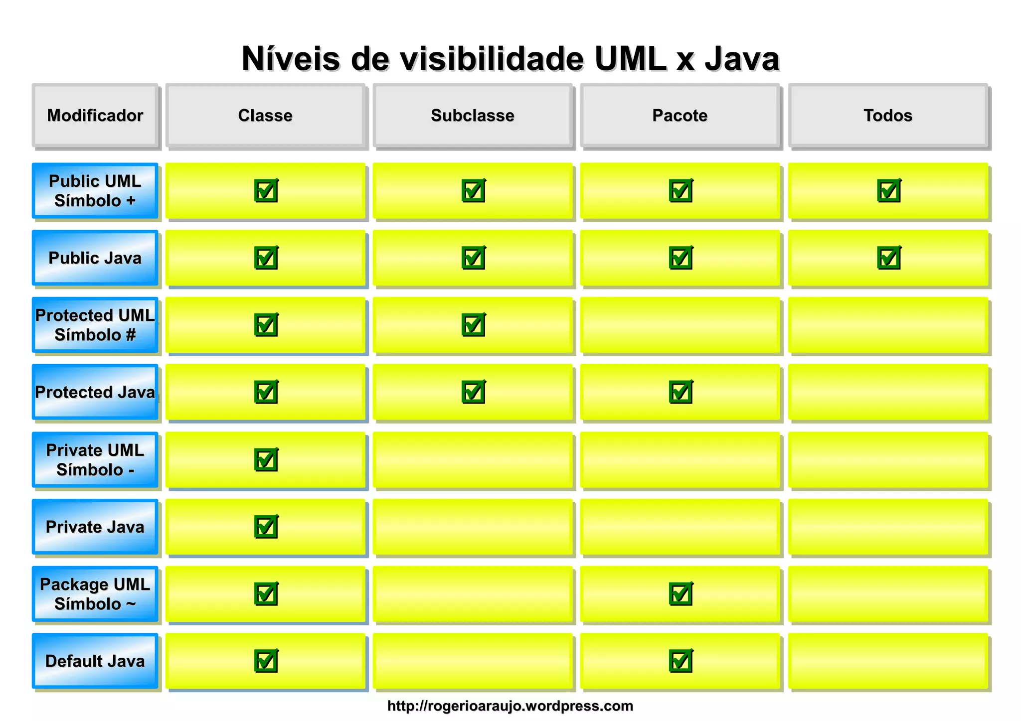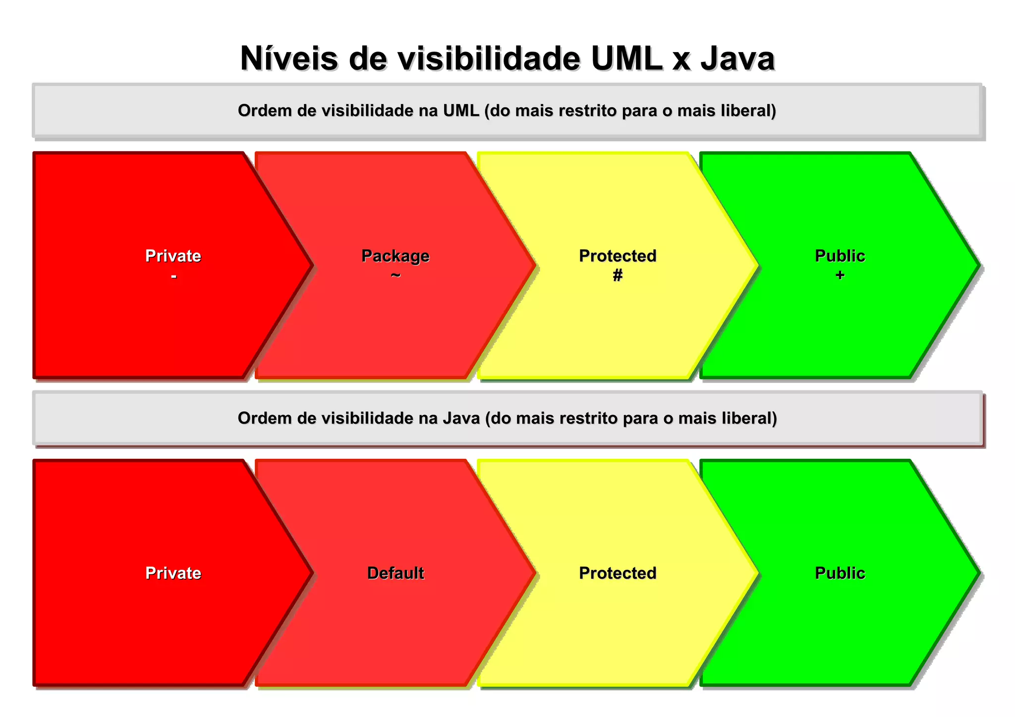 Ordem de visibilidade na UML (do mais restrito para o mais liberal)