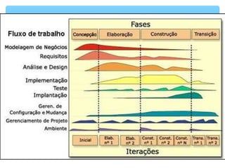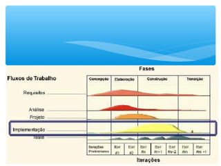 O documento descreve o Processo Unificado (PU) de desenvolvimento de software, que é iterativo e adaptativo. O PU divide o desenvolvimento em quatro fases (Concepção, Elaboração, Construção e Transição) e cinco fluxos de trabalho visando produzir sistemas complexos de forma incremental. Cada fase se concentra em aspectos diferentes como requisitos, análise, projeto, implementação e testes.