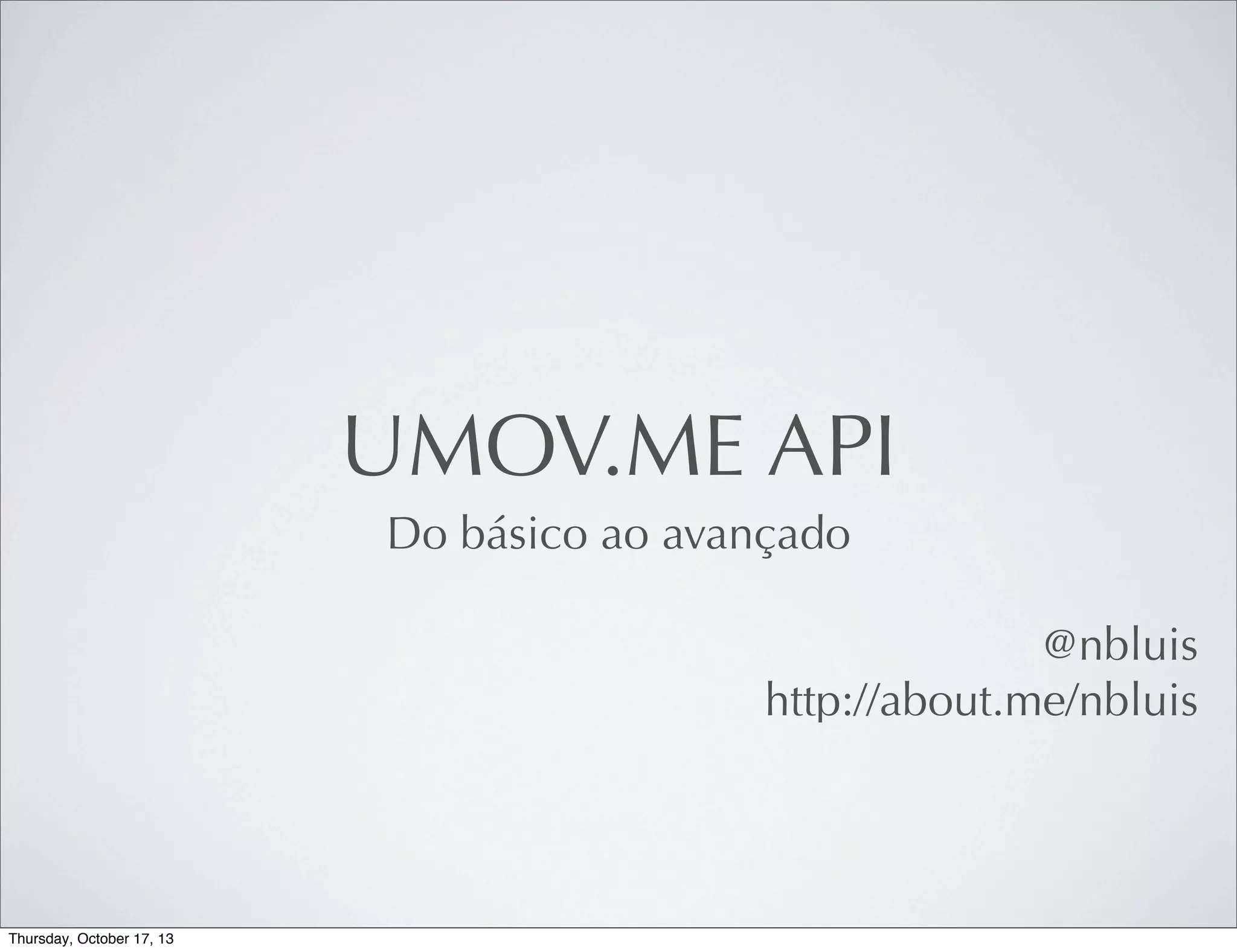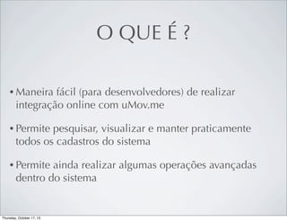 O documento fornece uma introdução à API do uMov.me, explicando como ela funciona através de requisições HTTP, XML e conceitos REST para permitir a integração e automação de tarefas no sistema. A API permite pesquisar, visualizar e manter dados como agentes e itens, bem como realizar outras operações avançadas.