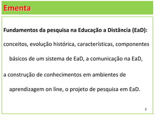 Este documento descreve o plano de curso da disciplina "Pesquisa em Educação a Distância" oferecida no Departamento de Métodos e Técnicas. O curso tem duração de 60 horas ao longo de um semestre, abordando conceitos e fundamentos da pesquisa em educação a distância, como a construção do conhecimento em ambientes online e a elaboração de uma proposta de pesquisa avaliativa em EaD.