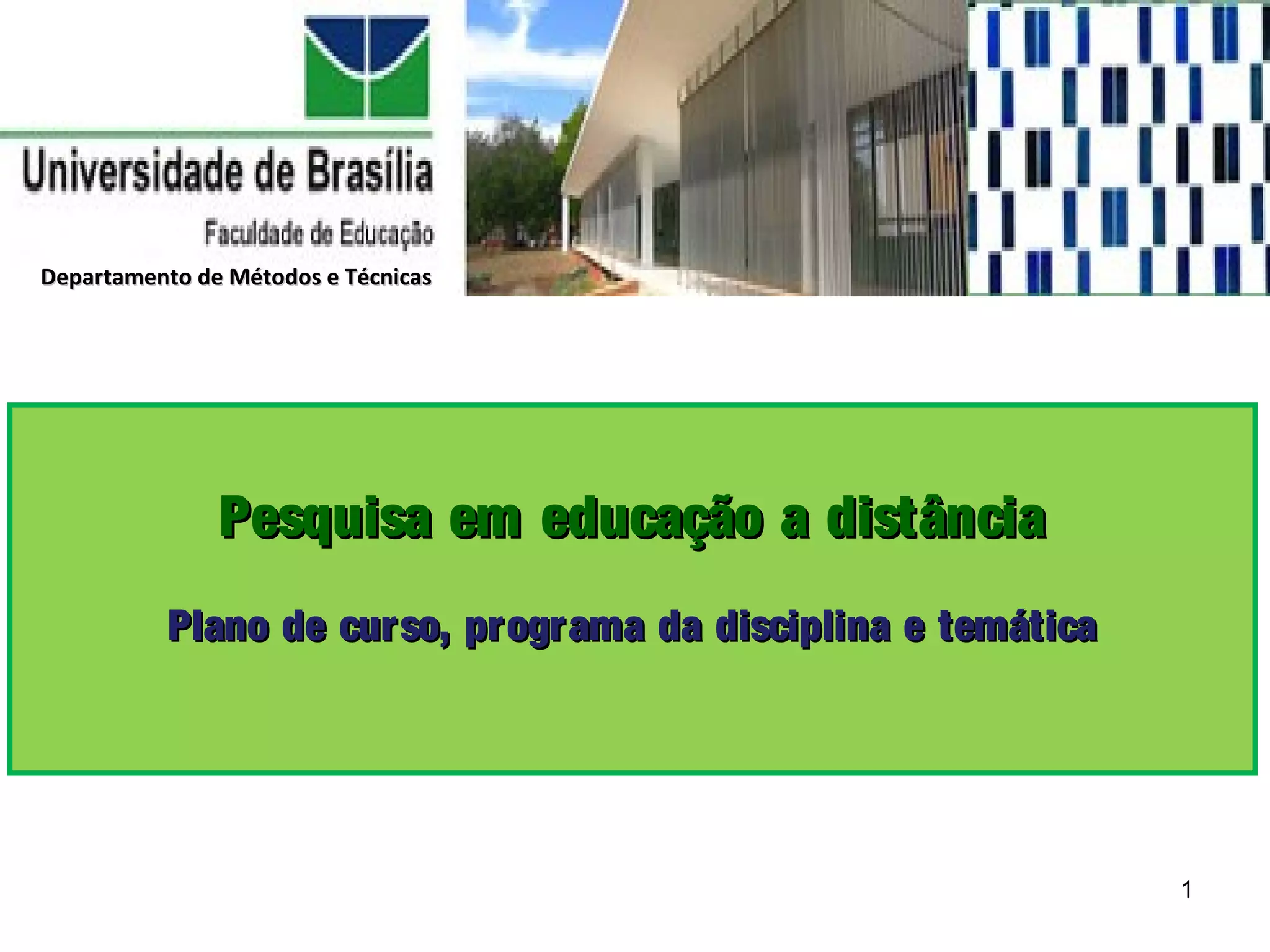 Este documento apresenta o plano de curso da disciplina "Pesquisa em Educação a Distância" oferecida no Departamento de Métodos e Técnicas. O curso aborda fundamentos da pesquisa em EaD, incluindo conceitos, evolução histórica e características. O objetivo é promover a construção de conhecimentos sobre EaD visando a elaboração de uma proposta de pesquisa avaliativa. As atividades incluem discussões presenciais e no ambiente virtual Moodle com foco na interação, constru