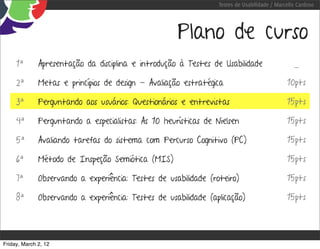 Este documento discute técnicas de pesquisa para testes de usabilidade, incluindo questionários, entrevistas, percursos cognitivos e inspeções heurísticas. Ele também aborda princípios importantes como focar nos usuários reais, evitar design auto-referenciado e coletar dados suficientes para evitar problemas de escopo.