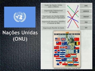 O documento discute a Organização das Nações Unidas (ONU) e suas principais agências. A ONU é composta pela Assembleia Geral, Conselho de Segurança, Conselho Econômico e Social e Tribunal Internacional. Agências como OMS, FAO, UNICEF e UNESCO trabalham em áreas como saúde, alimentação, infância e educação/cultura.