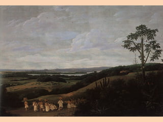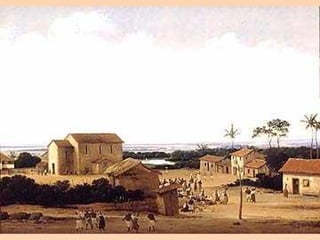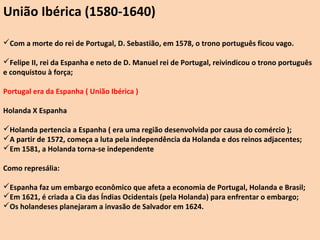 O documento resume a União Ibérica entre Portugal e Espanha no século 16 e a subsequente invasão holandesa do nordeste do Brasil entre 1624-1654. Ele descreve como a Holanda conquistou temporariamente parte do nordeste do Brasil, incluindo Salvador e Pernambuco, até serem expulsos pelos portugueses após as batalhas de Guararapes entre 1648-1649.