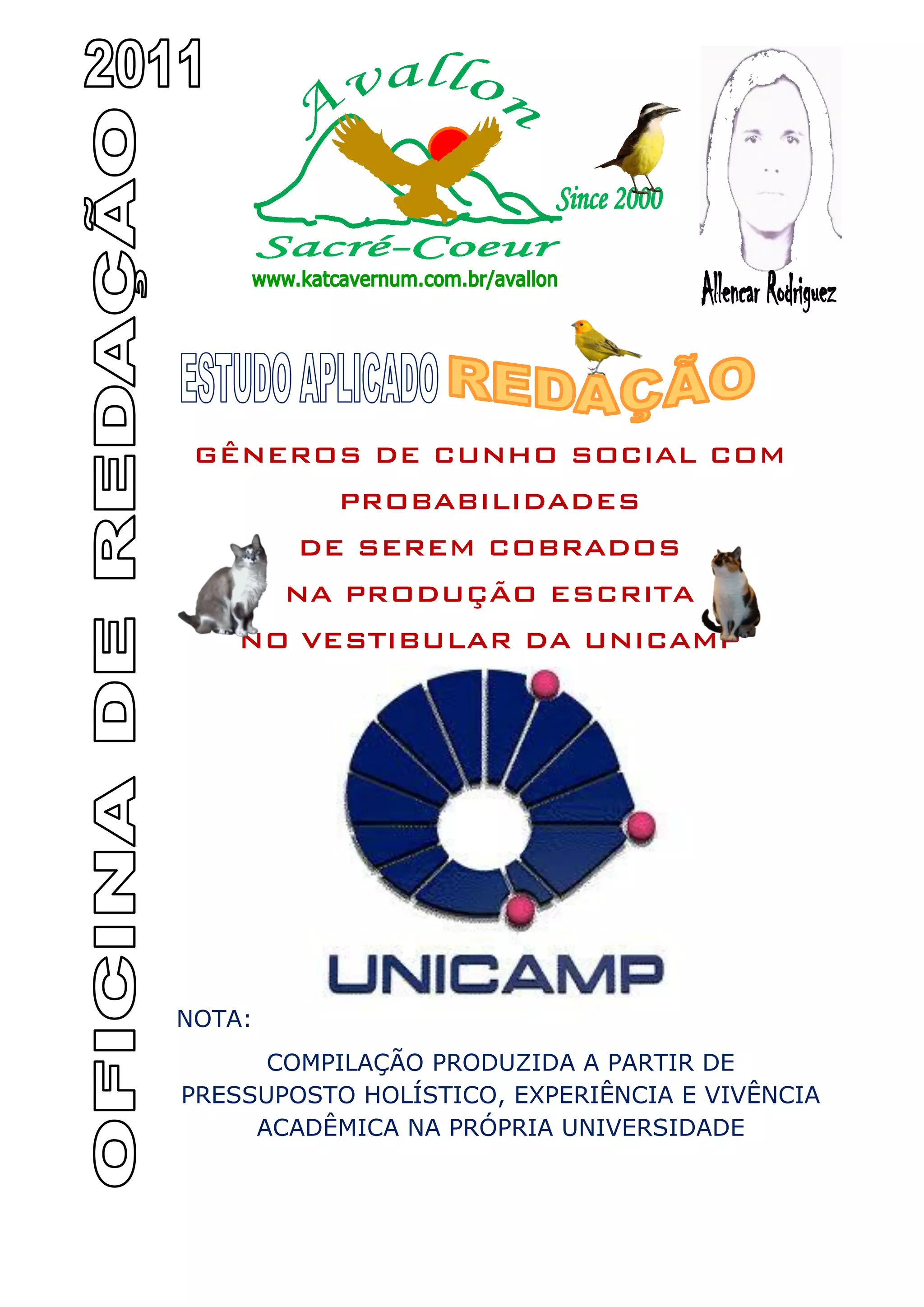 O documento lista vários gêneros textuais sociais que podem ser cobrados na produção escrita do vestibular da Unicamp, classificando a probabilidade de cada um ser cobrado. Há alta probabilidade de serem cobrados carta de leitor, tom de ironia na crônica e notícia de jornal. Manifesto e conto também têm boas chances. É recomendado conhecer a estrutura de todos os gêneros listados.