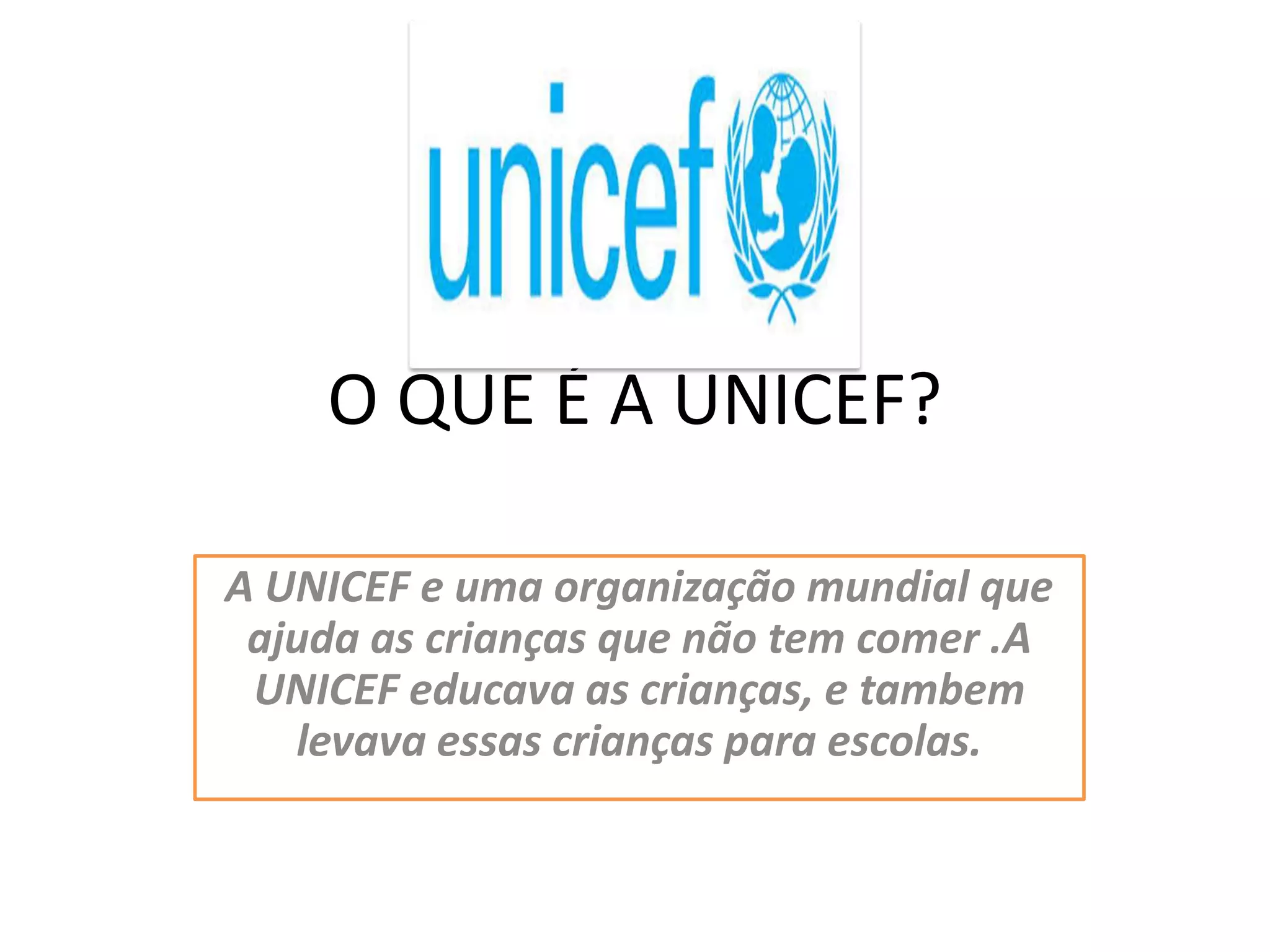 A UNICEF ajuda crianças carentes com alimentação e educação, levando-as para escolas e acabando com a exploração infantil.