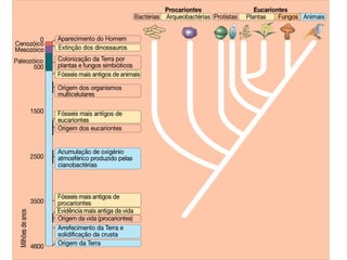 O documento discute a evolução biológica, comparando células procarióticas e eucarióticas. Apresenta duas hipóteses para a origem dos eucariontes: autogênese e endossimbiose. Esta última sugere que associações simbióticas entre células procariotas deram origem às células eucariotas complexas. Também discute a transição da unicelularidade para a multicelularidade, possivelmente a partir de colônias de células unicelulares.