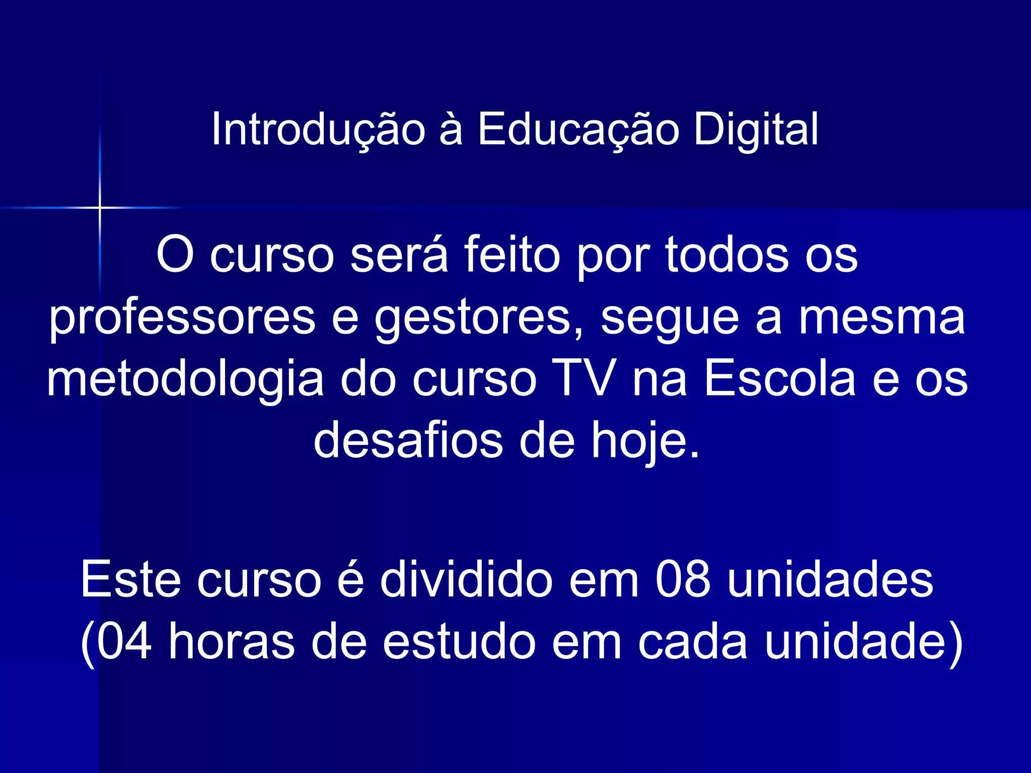 Este curso introdutório à educação digital é dividido em 8 unidades de 4 horas cada e aborda tópicos como tecnologias na sociedade e na escola, navegação e segurança na internet, blogs, edição de textos, cooperação online, apresentações digitais e planilhas eletrônicas. A Unidade 1 discute conceitos básicos de tecnologia e mídia e como integrá-las no ensino.