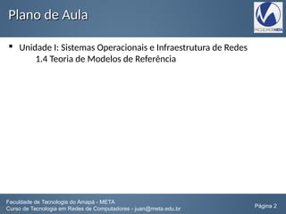 O documento discute a teoria de modelos de referência para redes de computadores. Apresenta o modelo OSI de 7 camadas projetado pela ISO para facilitar a comunicação entre sistemas abertos. Também compara o modelo OSI com o modelo TCP/IP, discutindo as camadas de cada um.