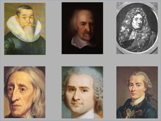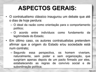 O documento descreve as ideias centrais do filósofo Thomas Hobbes sobre o contratualismo. Segundo Hobbes, no estado de natureza os homens vivem em constante conflito motivados pela competição, desconfiança e glória, levando a uma guerra generalizada. Para escapar deste estado de guerra, os homens firmam um contrato que cria um Estado absoluto com poder ilimitado de garantir a segurança através do medo. Hobbes defendia que só um governo onipotente poderia manter a ordem e a paz social.