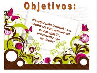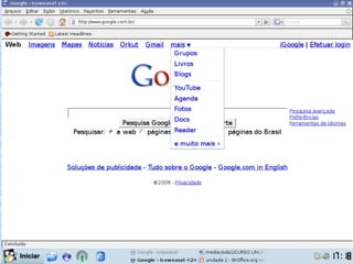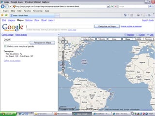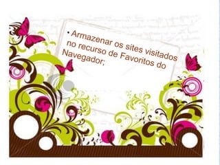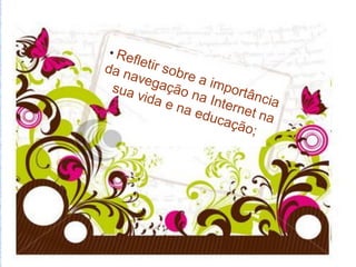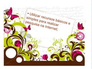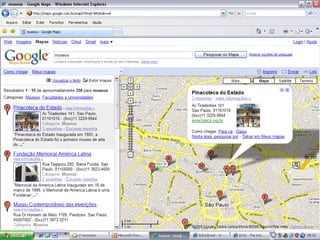 O documento discute o que é a Internet, como funcionam os endereços de sites, e fornece instruções para navegar e pesquisar na Internet, incluindo acessar sites de notícias e governamentais e realizar pesquisas com o Google.