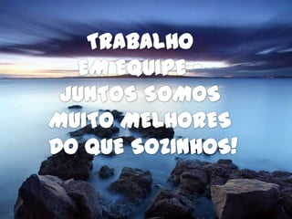 O documento discute a importância do trabalho em equipe no ambiente profissional. Ele explica que o trabalho em equipe envolve esforços coletivos para alcançar objetivos compartilhados, com cada membro desempenhando um papel específico. Também destaca que o sucesso ou fracasso de uma equipe depende do esforço de todos e que a colaboração permite superar problemas e alcançar mais do que o esperado.