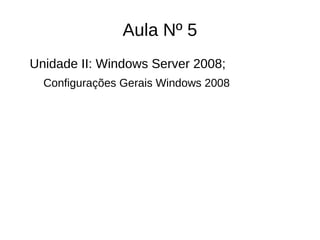 O documento descreve as configurações iniciais necessárias no Windows Server 2008 após a instalação, incluindo configurar placas de rede, DNS, nome do computador, ingressar em domínio, data/hora e desligar/reiniciar o servidor.