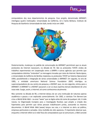 Este documento discute a unidade 3 sobre a Internet. Apresenta uma introdução à Internet, sua história e evolução desde a ARPANET até a Web 2.0. Também explica como a Internet funciona através de URLs, navegadores e hiperlinks, e destaca a importância da segurança online.