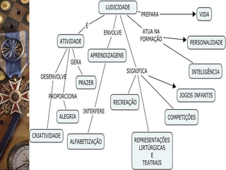 Este documento discute a importância de incluir atividades lúdicas como jogos e brincadeiras no ensino, especialmente nos anos iniciais. Ele apresenta os objetivos de trabalhar com ludicidade na sala de aula, os benefícios do brincar para o desenvolvimento das crianças e a relação entre brincadeiras e aprendizagem, especialmente da alfabetização e matemática. O documento também fornece diretrizes sobre como incluir atividades lúdicas de forma sistematizada no processo de ensino-aprendizagem.