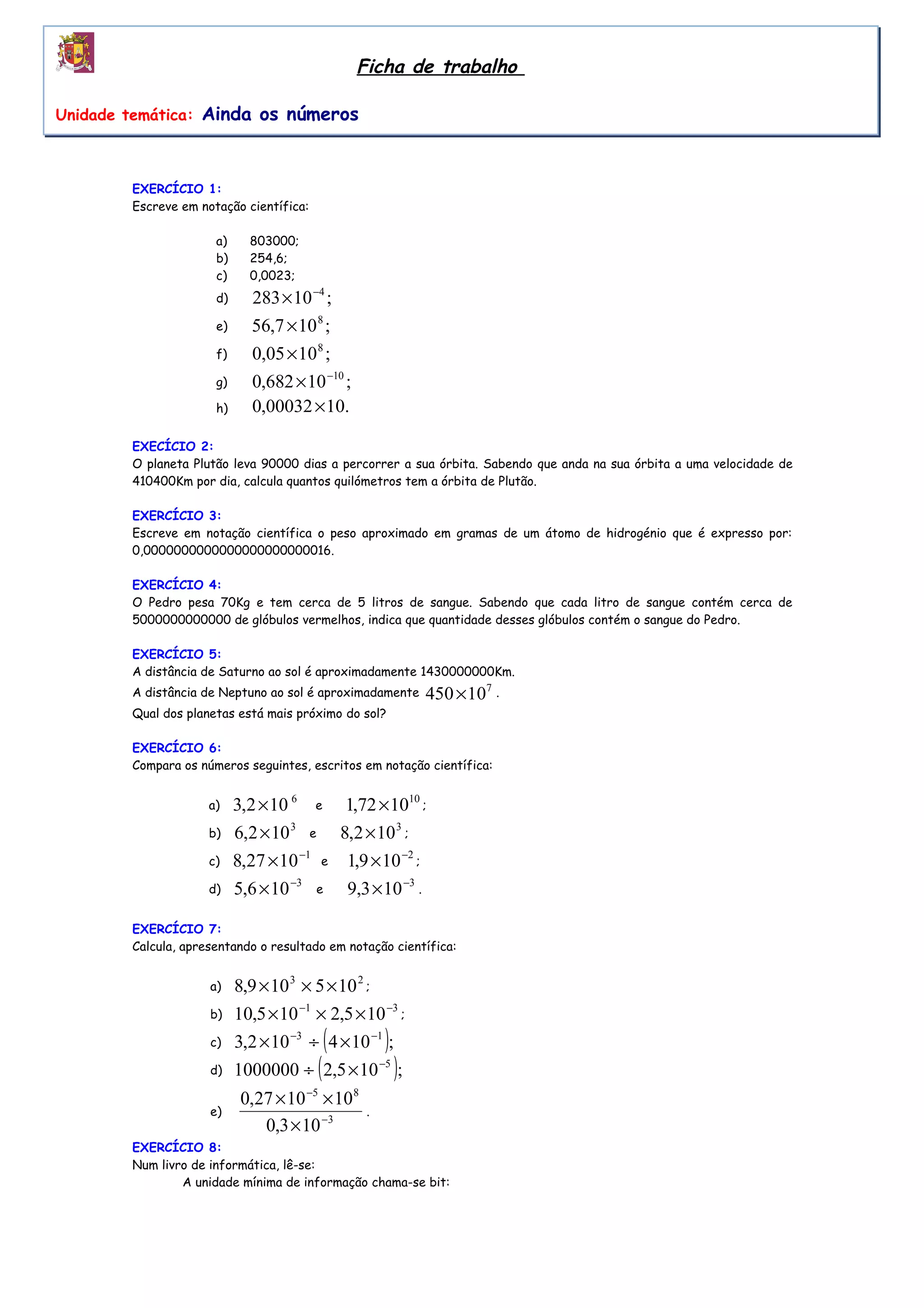 O documento contém 35 exercícios de matemática sobre números, notação científica, potenciação, frações, sequências numéricas e outros tópicos. Os exercícios variam de cálculos simples a problemas mais complexos e abrangem diferentes conceitos matemáticos.