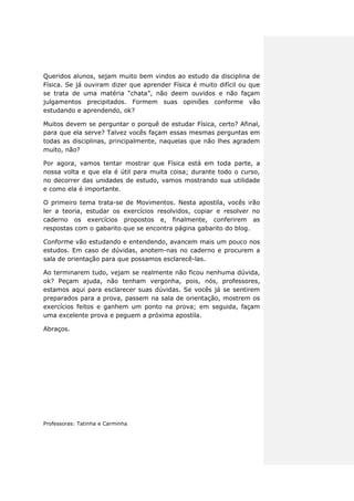 O documento apresenta um texto de introdução à disciplina de Física sobre o tema de movimentos. Nele, a professora dá as boas-vindas aos alunos e explica a importância de estudar Física sem julgamentos precipitados. Em seguida, apresenta o conceito de velocidade e realiza exercícios sobre unidades de medida e cálculo de velocidades médias e relativas.