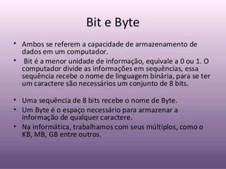 Os computadores armazenam instruções em grupos de bits chamados bytes, que atualmente contém oito bits cada. Existem termos para múltiplos de bytes como quilobyte, megabyte, gigabyte e terabyte, notados respectivamente como kB, MB, GB e TB para diferenciar de kilobit, megabit e outros múltiplos de bits.