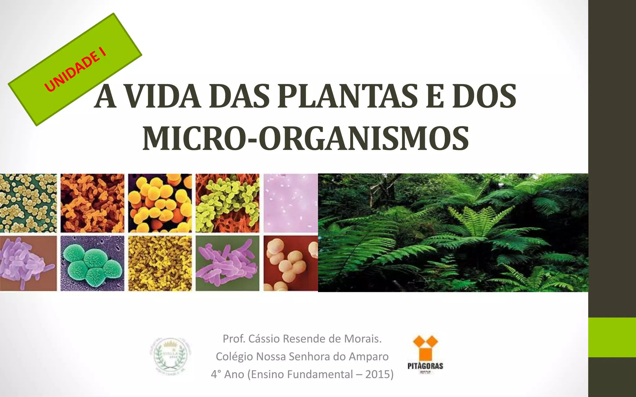 O documento discute a vida das plantas e micro-organismos. Aborda os principais grupos de plantas, suas estruturas e funções, reprodução, fotossíntese e outros processos. Também apresenta informações sobre bactérias, fungos, vírus e protozoários, além de suas interações com o meio ambiente e seres humanos.