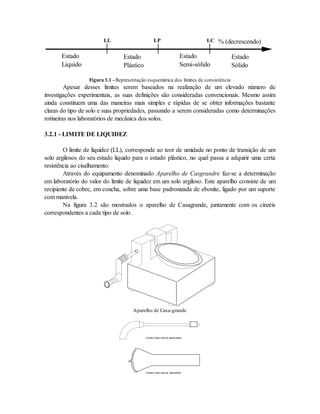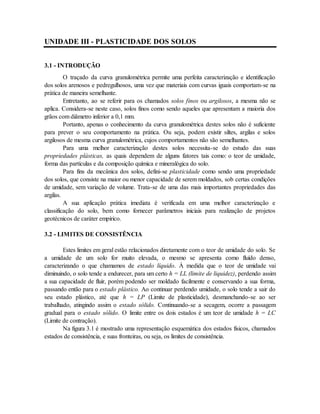 Este documento discute a plasticidade dos solos, que é a capacidade de serem moldados sob certas condições de umidade sem variação de volume. Define os limites de consistência de solos como liquidez, plasticidade e contração, que dependem do teor de umidade. Também apresenta índices como plasticidade e consistência para classificar solos.
