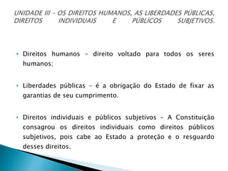 O documento discute a evolução dos direitos humanos ao longo da história, desde a Magna Carta até a Declaração Universal dos Direitos Humanos. Ele também diferencia entre direitos fundamentais e direitos humanos, e lista exemplos de direitos individuais, coletivos, sociais e políticos consagrados na Constituição brasileira. Por fim, destaca características como inalienabilidade, historicidade e relatividade dos direitos humanos.