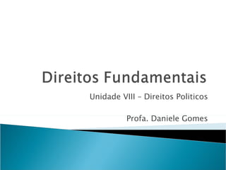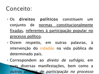 O documento descreve os direitos políticos no Brasil, incluindo o direito de voto, iniciativa popular e referendo. Apresenta os tipos de democracia e explica conceitos como capacidade eleitoral ativa e passiva, sufrágio, voto, inelegibilidade e perda dos direitos políticos.