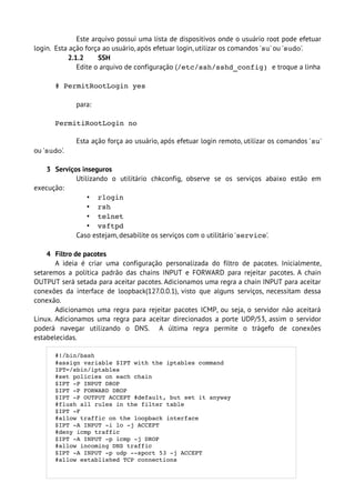1. O documento descreve etapas para aumentar a segurança de um sistema Linux após a instalação, incluindo proteger a BIOS e o GRUB com senhas, desabilitar login como root localmente e via SSH, desativar serviços inseguros como telnet, e configurar regras de firewall para rejeitar tráfego ICMP e aceitar apenas conexões DNS e estabelecidas.