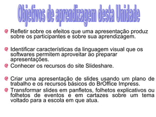 Este documento fornece instruções sobre como criar apresentações usando o software BrOffice Impress. Ensina os alunos a explorar o site SlideShare para encontrar apresentações, inserir imagens e efeitos nos slides, programar transições entre slides e salvar a apresentação finalizada. O objetivo é que os alunos desenvolvam uma apresentação com pelo menos 8 slides usando os recursos aprendidos.